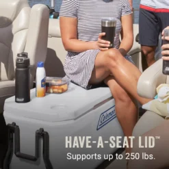 Inspired by our Wichita roots and the people who work there, the Coleman® 316 Series™ of hard coolers brings uncompromising quality and a legacy of craftsmanship and adventure wherever you take them. The 316 Series™ 100-Quart Marine Wheeled Cooler is the perfect cooler to bring on board for weekend fishing or boating trips with the fully insulated lid and body that Keeps the Ice™ up to 5 days in temperatures as high as 90°F. Made to withstand the challenging conditions of being on the water, the UVGuard™ coating helps protect the cooler from damaging sun rays and the stainless steel hardware prevents rusting and corrosion—extending the life of the cooler. An antimicrobial liner resists odor, mold, and mildew from forming in between boating trips. Haul your drinks easily from the harbor to your boat with the heavy-duty 6-inch wheels and durable tow & swing-up handles. The large capacity holds up to 160 so you’ll have plenty of drinks to go around for you and the entire crew. Take a load off with the Have-A-Seat™ lid that supports up to 250 lbs. as you wait for the day’s catch. Get bragging rights for reeling in the biggest catch with the built-in ruler on the lid that also tells you if your fish is too small and needs to be thrown back.