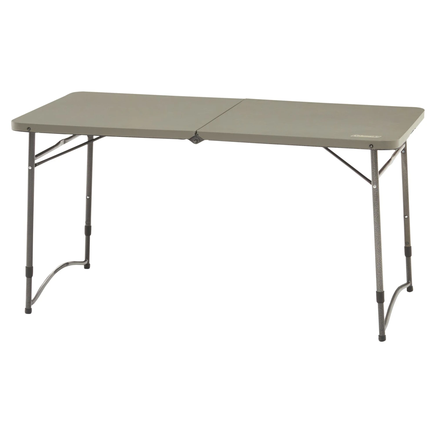 The Coleman 4 foot fold in half vacuum molded table is lightweight yet super strong! Its a useful size for camping, events and markets, it even features legs with adjustable height.