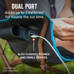 - Dual port battery dock near armrest holds up to 2 rechargeable lithium-ion batteries (2nd battery sold separately), doubling the runtime; also charges your phone or other devices