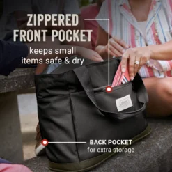 - Zippered front pocket keeps contents—such as a phone, keys, or wallet—safe and dry; back pocket for extra storage like a magazine, sunscreen, or bottle opener