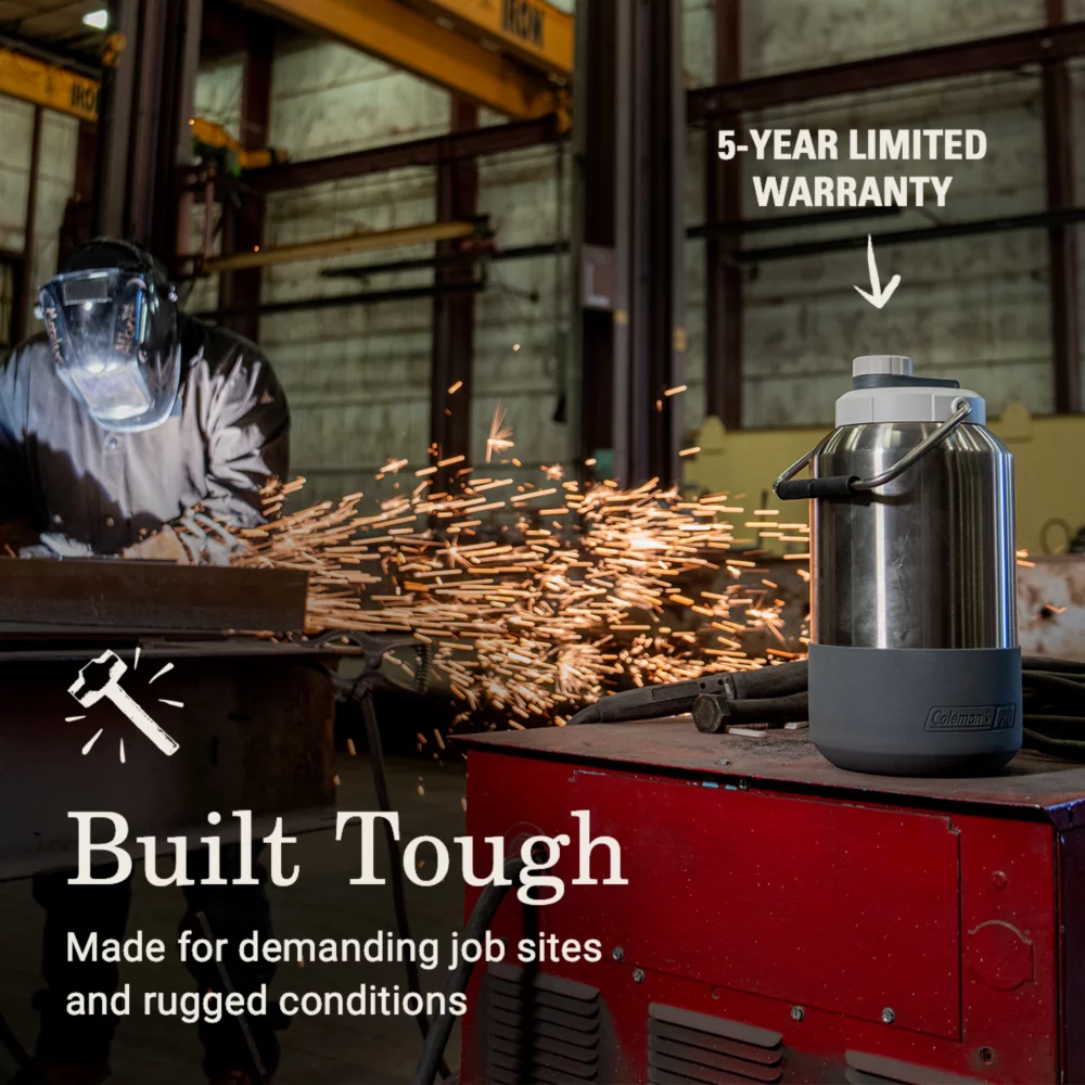 Coleman Pro is gear that works hard like you. It is purpose-built for everyday use in the most demanding environments. The Coleman Pro 1 Gallon Jug is built from durable copper-plated stainless steel and topped off with a fully insulated lid so your drink stays cold all day in the hot sun. Backed by a 5-year limited warranty, this water jug is designed with smart extras like a tethered leakproof cap that’s easy to handle in work gloves and won’t get away even if you drop it. The stainless steel water bottle’s silicone boot helps it stay put when you set it down and then pops off for easy cleaning in the dishwasher. An oversized handle makes for comfortable hauling while an anchor point accepts a carabiner to keep the stainless steel water bottle close at hand.