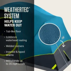 - BLOCKS WIND AND RAIN: WeatherTec™ system’s tub-like floor, welded corners, waterproof 3,000mm waterhead fabric, and inverted seams and taped seams on rainfly and tent body help keep water from getting in; strong frame has been tested to withstand up to 35 mph winds