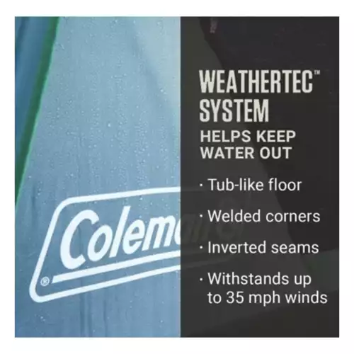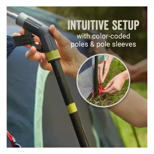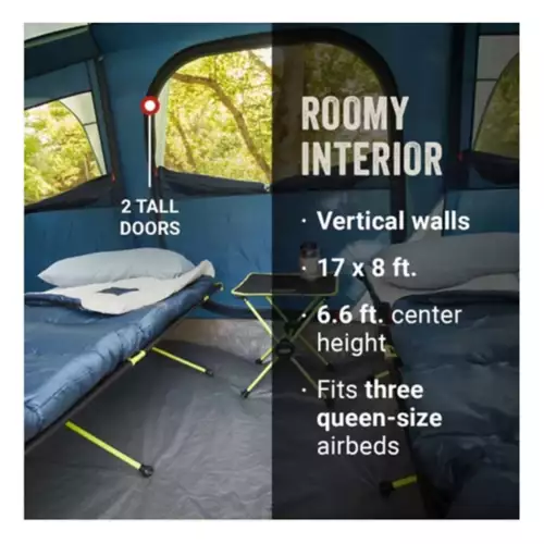 Grab your gear, gather your crew, and make memories outside with the Coleman® Sunlodge™ Camping Tent that’s roomy enough to fit your family comfortably. Color-coded poles and pole sleeves provide easy, intuitive setup so you spend less time pitching the tent and more time relaxing around the campfire. Two tall doors make it easier to move airbeds, sleeping bags, and other gear in and out of the tent. With 8 windows and 2 large door awnings, you’ll get great views and enjoy plenty of fresh air throughout the tent. Rain in the forecast? This tent features the WeatherTec™ system, with welded corners and inverted seams that help keep you and your gear dry. The spacious size fits 3 queen-sized airbeds, perfect for the entire family or a group of friends. The Sunlodge comes in 8-person, 10-person, and 12-person sizes.